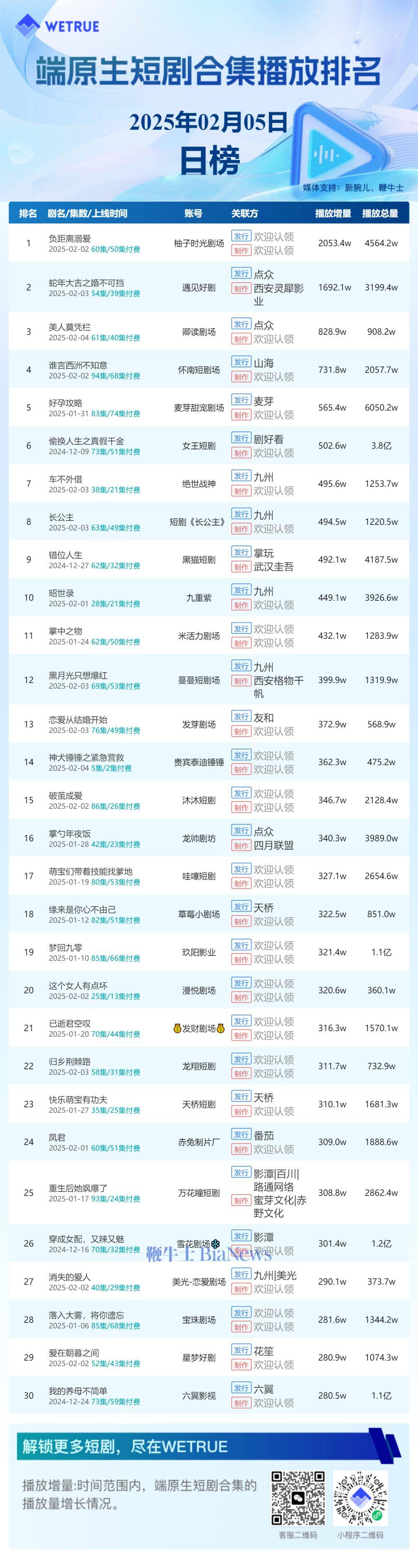 通过这一创新性的合作模式,新腕儿、鞭牛士与wetrue短剧热度榜共同为短剧领域注入了新的活力,不仅丰富了短剧的宣传渠道,也为创作者提供了更多展示才华的舞台。未来,随着短剧市场的不断壮大,这一榜单有望成为衡量短剧影响力的重要指标之一。