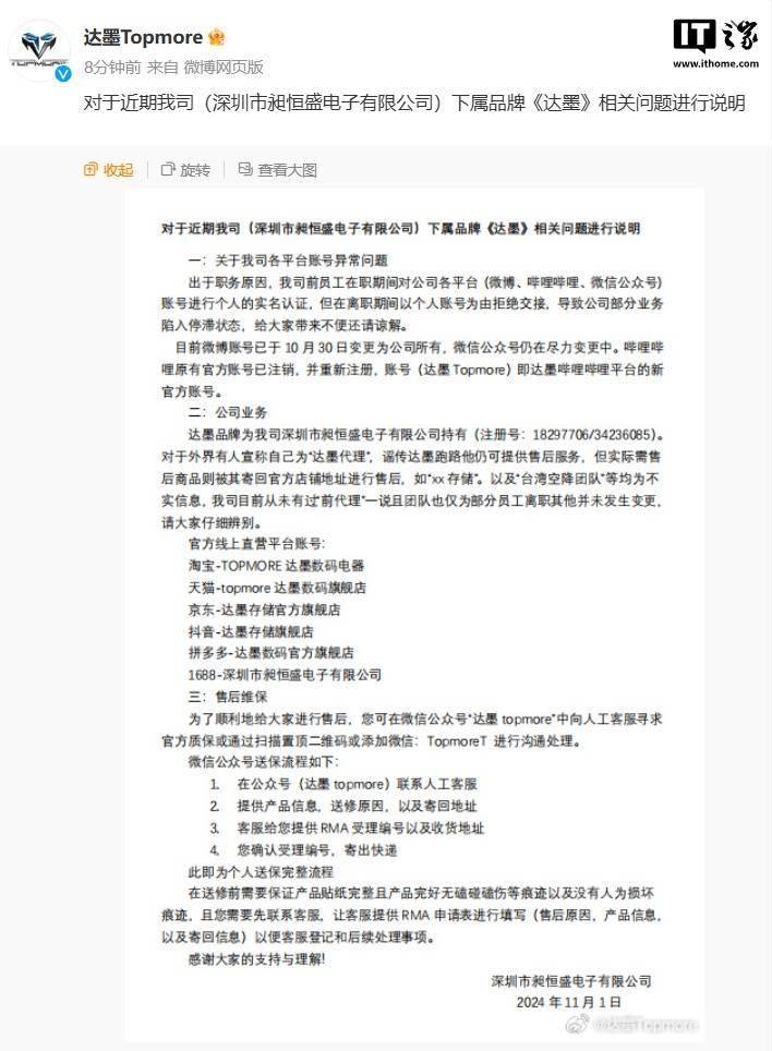 达墨科技随后通过官方微博发布声明,详细解释了事件经过。声明指出,由于前员工在离职期间拒绝交接已实名认证的各平台账号,导致公司业务受到一定影响。目前,公司已成功收回微博账号,并正在努力变更微信公众号所有权。同时,达墨科技已在b站重新注册官方账号,以继续为用户提供服务。