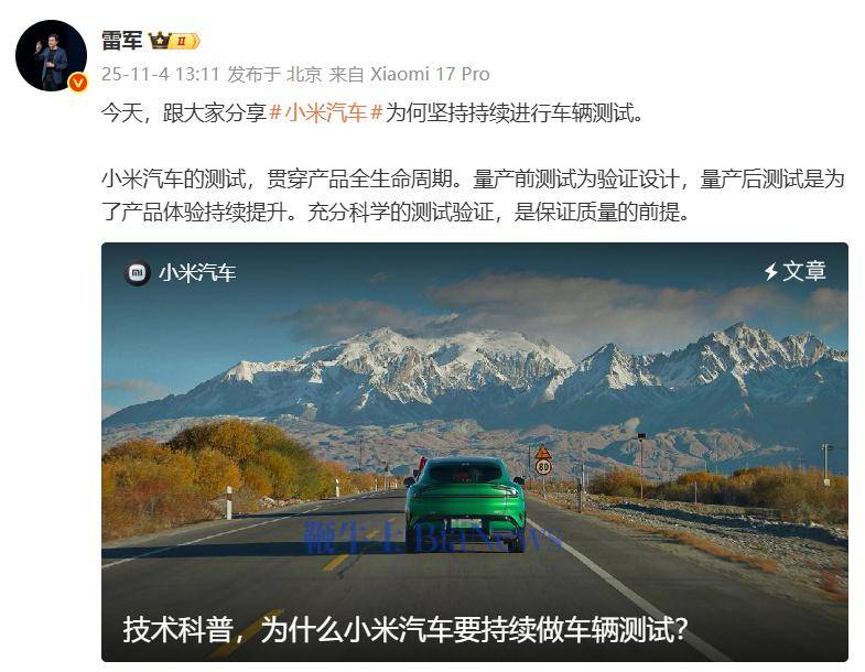 据官方透露,小米汽车未来将加大测试投入,拓展至更多细分领域,通过“十倍资源”强化质量管控。这一策略旨在覆盖更广泛的用户场景,确保产品在全生命周期内持续满足高品质需求。