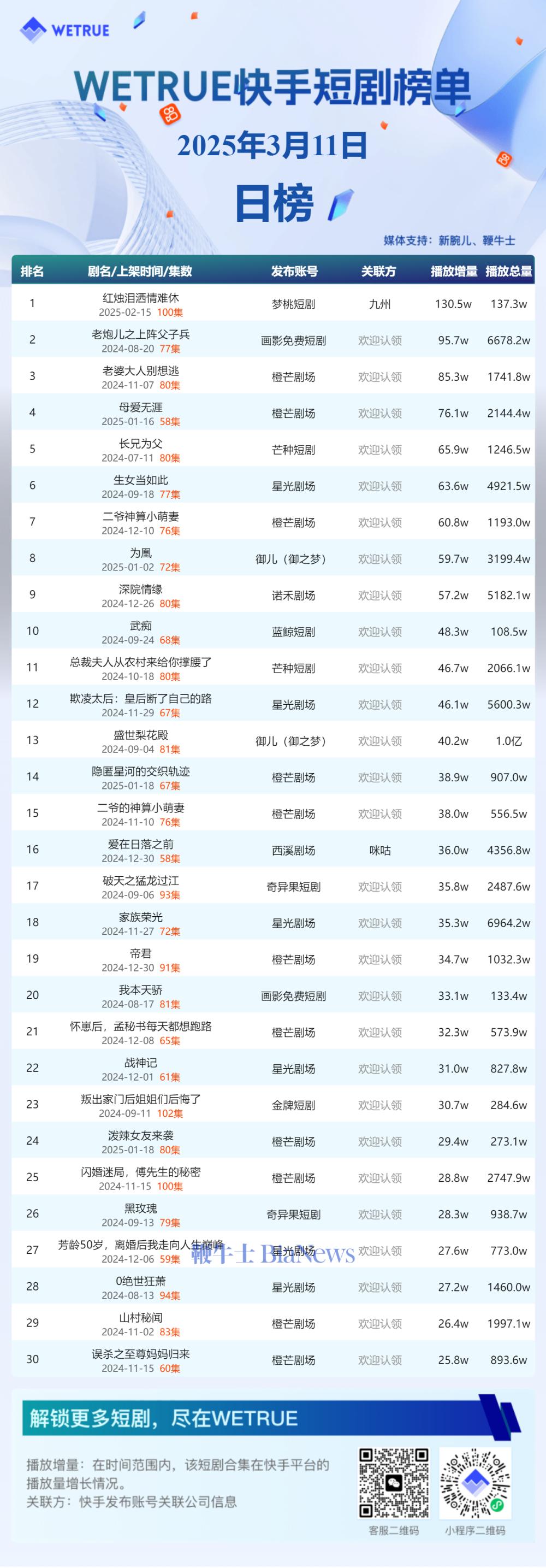近日,为了赋能短剧创作者并提升行业透明度,新腕儿这一专注于短剧领域的报道平台携手科技媒体鞭牛士,联合wetrue短剧热度榜,共同揭晓了一系列短剧热度榜单。