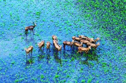 洞庭湖畔,麋鹿的故事堪称传奇。这种曾被尊为神兽的物种,自1900年在中国本土灭绝后,历经波折重返故土。如今,在洞庭湖区,麋鹿种群已壮大到300余头。它们的回归之路充满艰辛:1998年洪水期间,湖北石首天鹅洲的11头麋鹿泅渡至洞庭湖,形成野生自然衍生种群;2016年,16头大丰“盐碱滩涂湿地”的麋鹿被野放到洞庭湖,实现两地种群基因融合;2020年,12头来自北京南海子的麋鹿引入,完成三大种群迁地野化融合。如今,东洞庭湖核心区麋鹿成群,南洞庭湖也出现迁居迹象,这片水域正成为它们安居乐业的家园。