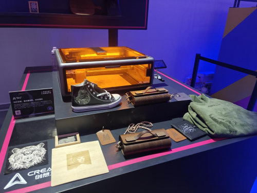 而在另一侧,激光雕刻机 creality falcon a1 pro 则展示了对不同材质的驾驭能力。现场摆放的展品涵盖了纹理细腻的帆布鞋、质感十足的皮包以及精美的木刻画和吊牌。这种在皮革、木材、织物等多种材质上进行精准刻画的能力,为个人工作室或手工爱好者提供了更多定制化创作的可能。