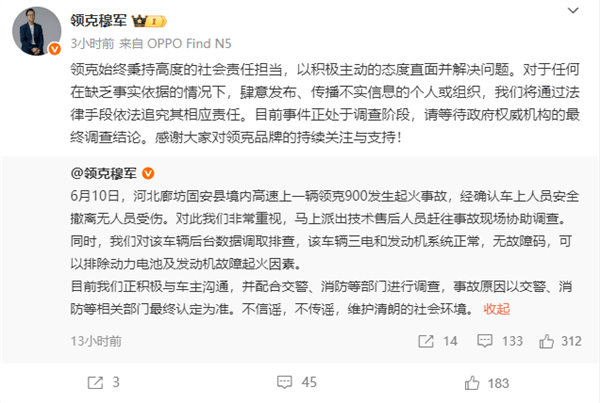 穆军还透露,领克正在积极与车主进行沟通,全力配合交警、消防等部门的调查工作。他强调,事故的具体原因将以交警、消防等相关部门的最终认定为准。同时,他也呼吁社会各界不信谣、不传谣,共同维护一个清朗的社会环境。