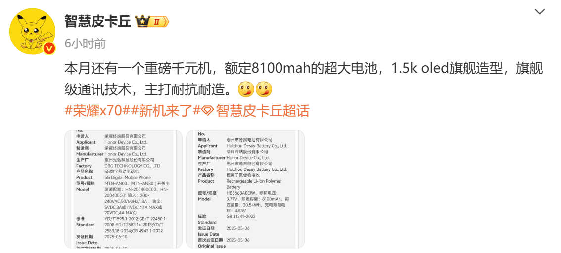 荣耀在电池技术上的突破,无疑为消费者带来了更持久的续航体验。与上一代x60系列相比,x70系列在电池容量上实现了质的飞跃。x60系列中,电池容量最高的是x60pro的6600mah,而即将发布的x70系列新机,电池容量直接跃升至8100mah,这一数字刷新了荣耀乃至整个行业的记录。