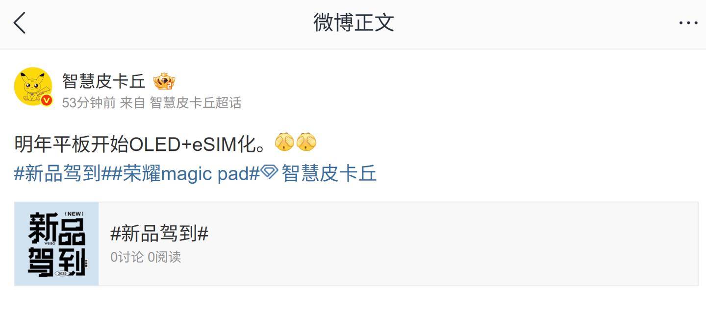 今日,知名数码博主@智慧皮卡丘在社交平台曝光了某国产厂商的平板新品规划。据其透露,该品牌将于明年推出首款搭载oled屏幕的平板设备,并首次引入esim技术,实现无实体卡槽的移动网络连接功能。
