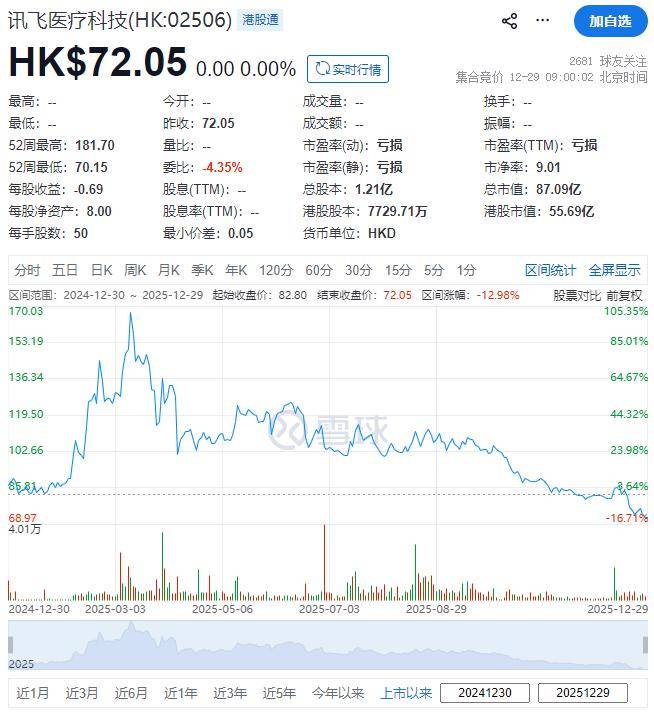 回顾讯飞医疗科技的上市历程,该公司于2024年12月30日在港交所成功上市,当时以每股82.80港元的价格发行了703.55万股h股,成功募资5.83亿港元。截至2025年12月29日收市,公司股价报72.05港元,总市值约为55.69亿港元。尽管市场环境复杂多变,但讯飞医疗科技凭借其强大的技术实力和广阔的市场前景,依然赢得了投资者的广泛关注和认可。