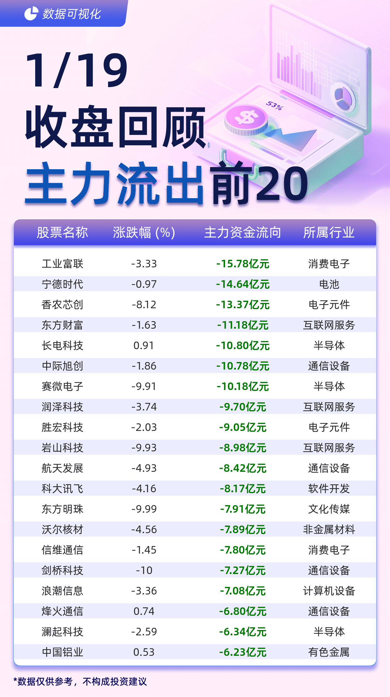 根据交易所最新披露的资金流向数据,1月19日a股市场主力资金净流出规模显著扩大,工业富联、宁德时代等20只个股成为资金撤离的“重灾区”。其中,电子制造龙头工业富联以15.78亿元的单日净流出额领跌全市场,新能源板块标杆宁德时代紧随其后,净流出金额达14.64亿元。